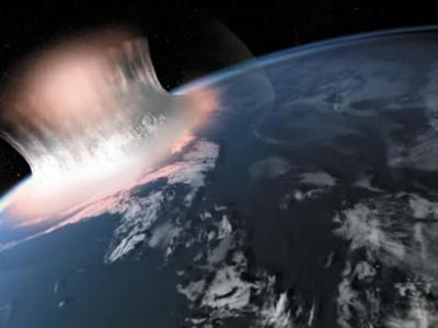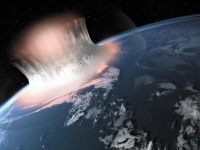 大型陨星撞击复原图 科学家在格陵兰岛发现了一个宽达100公里的陨石坑,这是由一...