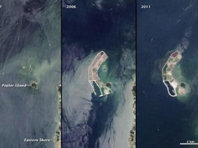 大西洋切萨皮克湾原本几近消失的波普拉岛在修复前后的景象对比 美国宇航局地球...