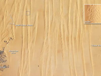 埃及“大沙海”的线形沙丘 美国宇航局地球观测站今日公布了一张卫星照片,展示了...