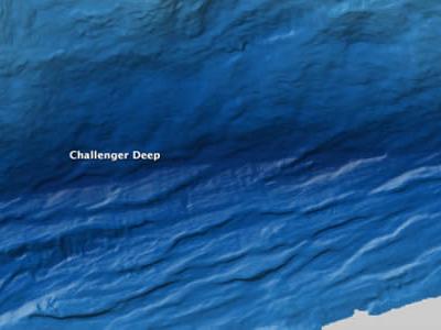 世界上最深的海沟:马里亚纳海沟 蓝色的深浅代表海洋深度的变化,蓝黑色表示最...