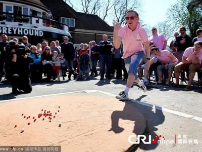 当地时间2012年4月6日,英国Tinsley Green,世界弹球锦标赛上,一名选手击出弹球...