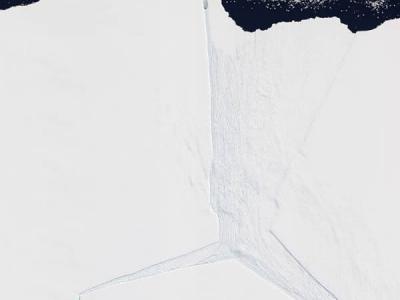 照片呈现了艾默里冰架的一小部分,其中有三条巨大的裂缝交汇。最大的那条裂缝与冰...