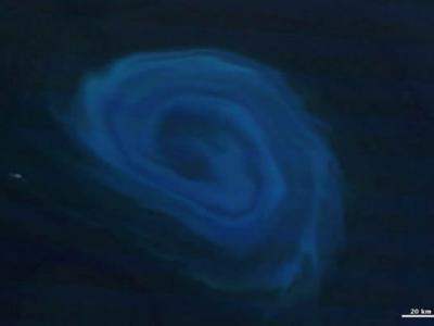 特写镜头,显示海洋漩涡的结构。这个漩涡宽度达到150公里,之所以呈现为蓝色,是...