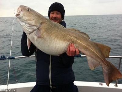 英国男子在英吉利海峡钓到重达40斤的大鳕鱼