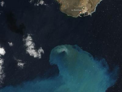 西班牙耶罗岛海底火山再次喷发 美国宇航局地球观测站今日公布了一张卫星照片,展...