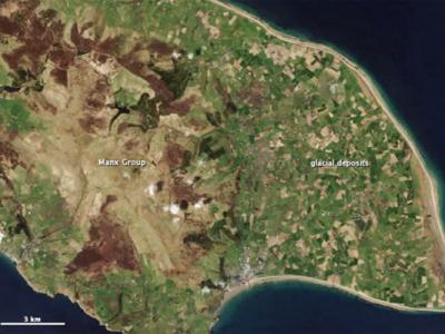 英国马恩岛保存数亿年历史岩层 美国宇航局地球观测站公布了一张卫星照片,展示了...