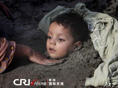 巴基斯坦儿童被家长埋在土中戴上眼镜观看日食。 巴基斯坦儿童被家长埋在土中戴...