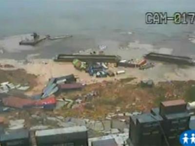 巴西马瑙斯港码头出现300米长的天坑,图中货物陆续掉下。(视频截图) 巴西马瑙...