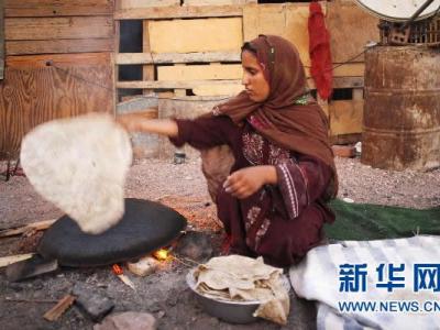 在埃及西奈省边境重镇塔巴的一个小村庄,一名贝都因母亲用传统方式(倒扣铁锅)烙...