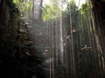 红牛悬崖跳水世界系列赛 一名悬崖跳水运动员入水前的动作表演 俄罗斯运动员...