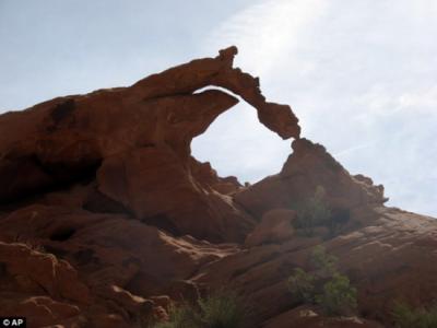 倒塌前的美国火焰谷标志性砂岩拱门 倒塌后的天然拱门。公园管理员哈蒙斯正对倒...