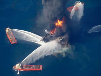 消防队员在扑灭深水钻井平台的大火 “深水地平线”钻井泄漏的石油仍在墨西哥...