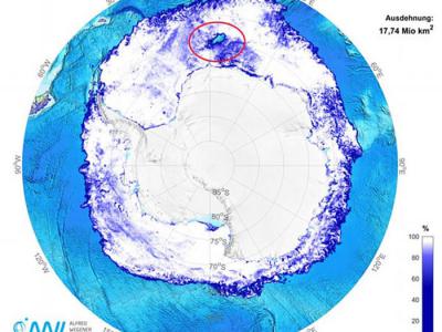 威德尔海冰湖(红圈示)的面积巨大。冰间湖是为极圈...