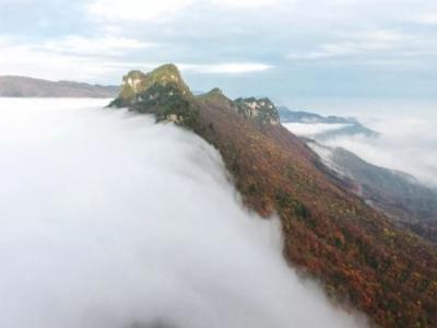 神农架天门垭清晨出现涌云。云雾自山体一侧向山谷“...