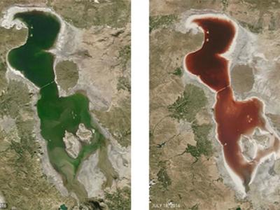 血色转变:尔米亚湖在4月23日还呈现绿色,等到7月18日透过NASA卫星观测,才发现该...