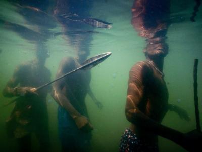 艾尔莫罗族的部落男子带着鱼叉与耐心,沿着图尔卡纳湖东岸用传统方法捕鱼。 Phot...