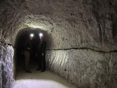 英国国家遗产基金会项目经理乔恩·巴克与志愿者戈登·韦斯戴着头灯,检查多佛的地...