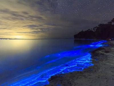 澳大利亚新南威尔士州南海岸杰维斯湾海湾被大量蓝色荧光海藻点亮 (蜘蛛...