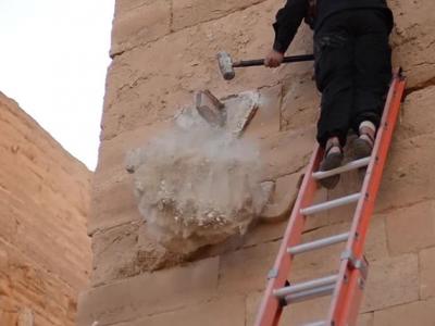IS分子爬长梯,用重锤破坏雕像。 IS分子以AK-47扫射古城外墙。 古城外的石...