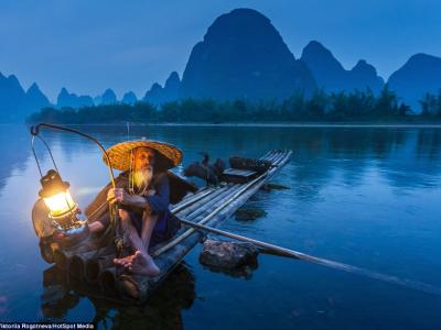 俄罗斯摄影师维Viktoriia Rogotneva拍摄漓江边老渔民用鸬鹚捕鱼照...