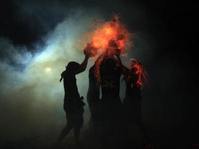 印尼巴厘岛举行“Mesabatan Api”净化仪式 彼此投掷燃烧的椰子壳 (蜘蛛...