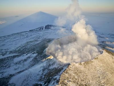伊里布斯峰在罗斯海投下长长的影子。伊里布斯峰是南极洲最活跃的火山,也是全世界...