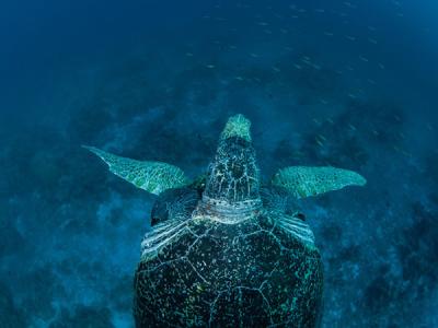 欧罗帕岛一只母绿蠵龟被它的伴侣紧拥在怀,漂游在欧罗帕环礁的湛蓝海域。这里是濒...