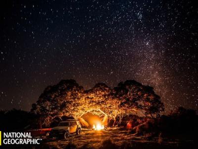 美国夏威夷星空下的营火 (蜘蛛网)营火的光芒照亮了夏威夷的夜空。本图拍摄于3...