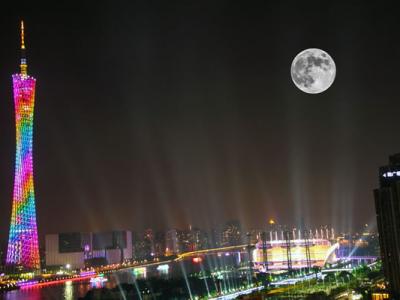 9月19日,中秋佳节,珠江沿岸华灯璀璨,市区上空在阵阵雷雨后变得清新通透,皎洁...