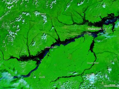 卫星照片显示俄罗斯远东地区的特大洪水景象