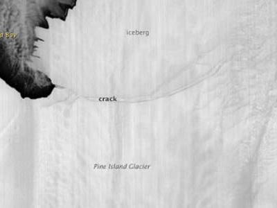 卫星照片显示南极洲松岛冰川新的冰岛的诞生