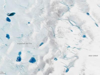 卫星照片展示格陵兰冰盖夏季的融冰景象