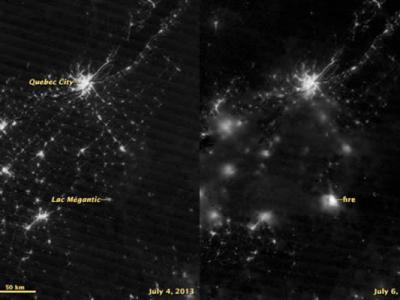 卫星照片显示加拿大魁北克列车脱轨引发火灾 美国国家航空航天局地球观测站(NASA...