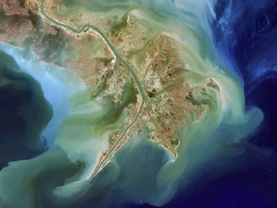 2007年,“死亡地带”导致的藻类爆发使墨西哥湾呈现大面积的绿色 据美国国家地理...