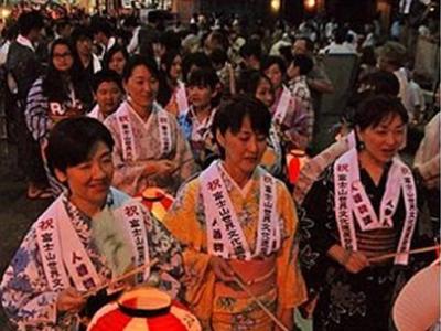 搭着特制布手巾,提着的灯笼游行的女士们 据日本时事通讯社7月1日报道,为庆祝富...