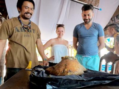 汶悦(左一)希望靠龙涎香致富。巨石疑为龙涎香。龙涎香(图)...