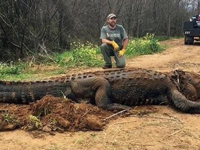 美国乔治亚州318公斤重巨型短吻鳄卡在水