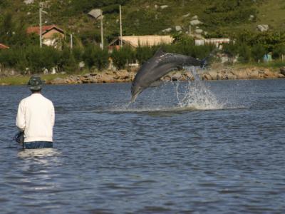 在这张由俄勒冈州立大学提供的2008年照片中,海豚在巴西拉古纳的Praia da Tesoura的...