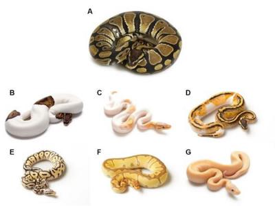 圈养球蟒(Python regius)颜色变化的小样本。Credit: McGill University(蜘蛛网e...