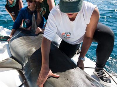 帕特里夏·阿尔巴诺(前)和一组鲨鱼研究人员从佛罗里达州迈阿密的一条大型虎鲨身上...