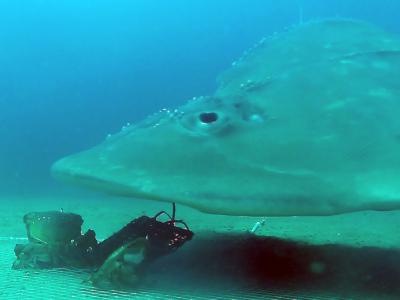 水下摄像机捕捉到濒临灭绝的吉他鱼捕食扳手蟹。(阳光海岸大学)(蜘蛛网eeook.com...
