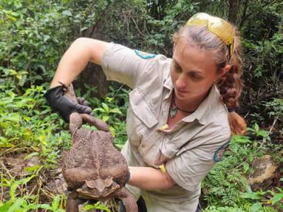 一名公园护林员拿着一只重达2.7公斤的甘蔗蟾蜍,在澳大利亚昆士兰州的康威国家公园...