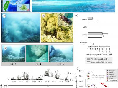 热液喷口系统研究区的景观和理化特征。(a) 奎山岛研究地点(北纬24°50′,东经1...