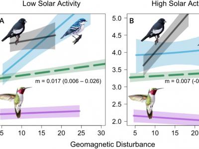 地磁扰动对流浪的影响因太阳活动水平而异。低太阳活动(A,21天太阳黑子数= 20,-平...