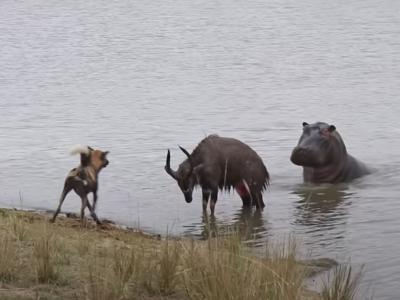 南非克鲁格国家公园一只安氏林羚遭非洲野犬河马围攻正要脱困 下秒被鳄鱼咬死(蜘蛛...