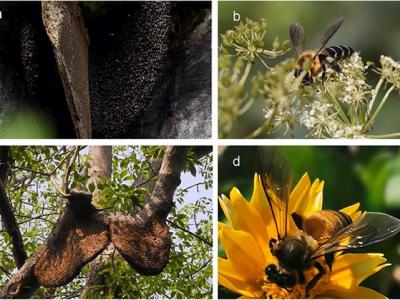 野外黑大蜜蜂和大蜜蜂:(a)黑大蜜蜂在悬崖上筑巢,(b)黑大蜜蜂在传粉,(c)大蜜蜂在...