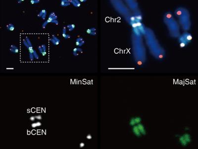 类精子干细胞中小鼠二号染色体和X染色体以头对头形式融合形成双臂染色体(红色:端...