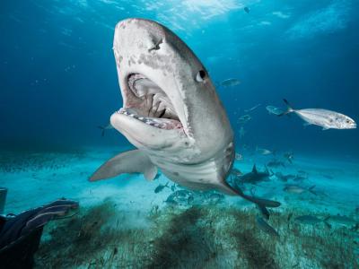 巴哈马一处称为老虎滩(Tiger Beach)的潜水胜地有不少鼬鲨。 PHOTOGRAPH BY BRIAN...