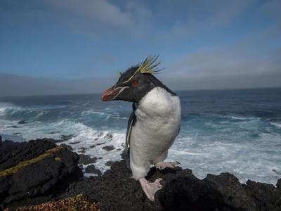 一只南跳岩企鹅(southern rockhopper penguin)站在南非马里恩岛的一处悬崖上。 P...