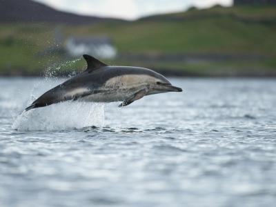 一只真海豚在苏格兰的海域嬉戏。学者观察到一只名为凯莉的野生独居海豚可以像港湾鼠...